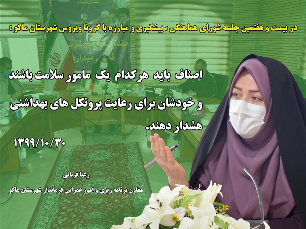 معاون برنامه ریزی و امور عمرانی فرماندار شهرستان ماکو در بیست و هفتمین جلسه شورای هماهنگی ، پیشگیری و مبارزه با کرونا ویروس شهرستان :