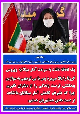 رعنا قربانی - سرپرست فرمانداری و رئیس شورای هماهنگی ، پیشگیری و مبارزه با کرونا ویروس شهرستان ماکو :
