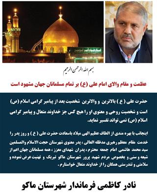 پیام تبریک نادر کاظمی فرماندار شهرستان ماکو به مناسبت ولادت باسعادت حضرت علی ( ع ) و روز پدر