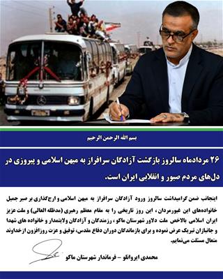 پیام تبریک محمدی ایروانلو فرماندار شهرستان ماکو بمناسبت 26 مرداد سالروز بازگشت آزادگان سرافراز به میهن اسلامی
