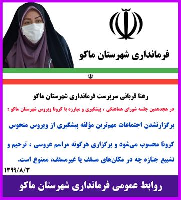 برگزارنشدن اجتماعات مهمترین مؤلفه پیشگیری از ویروس منحوس کرونا محسوب میشود و برگزاری هرگونه مراسم عروسی ، ترحیم و تشییع جنازه چه در مکانهای مسقف یا غیرمسقف، ممنوع است.