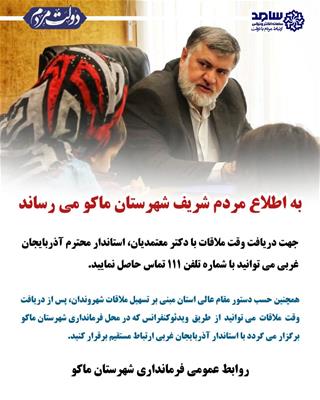 همچنین حسب دستور مقام عالی استان مبنی بر تسهیل ملاقات شهروندان، پس از دریافت وقت ملاقات می توانید از طریق ویدئوکنفرانس که در محل فرمانداری شهرستان ماکو برگزار می گردد با استاندار آذربایجان غربی ارتباط مستقیم برقرار کنید.