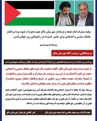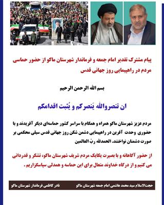 به گزارش پایگاه اطلاع رسانی فرمانداری شهرستان ماکو ؛ راهپیمایی جهانی روز قدس 1402 در آخرین جمعه ماه مبارک رمضان از ساعت 11 صبح در ماکو از مقابل مخابرات ولایت به سمت مسجد جامع ماکو با حضور پر شکوه اقشار مختلف مردم و مسوولان برگزار شد.