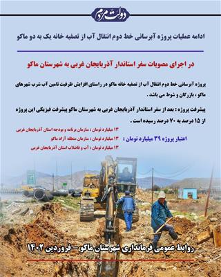 پروژه آبرسانی خط دوم انتقال آب از تصفیه خانه ماکو در راستای افزایش ظرفیت تامین آب شرب شهرهای ماکو ، بازرگان و شوط می باشد.