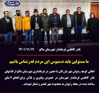 اهالی کوچه رضوان شهر بازرگان با حضور در فرمانداری شهرستان ماکو از تلاشهای نادر کاظمی فرماندار شهرستان در خصوص پیگیری و تلاش برای الحاق هفت بنای ساخته شده در محله رضوان به محدوده شهر تقدیر و تشکر نمودند .