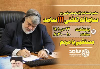 محمدصادق معتمدیان استاندار آذربایجان غربی روز پنجشنبه 22 دی 1401 راس ساعت 8:30 الی 10 با حضور در سامانه ارتباط مردم و دولت (سامد) و از طریق تلفن 111 بهصورت مستقیم پاسخگوی تماسهای مردم عزیز خواهد بود