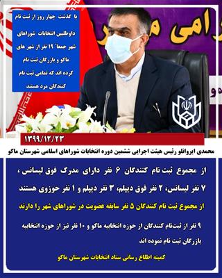 با گذشت چهار روز از ثبت نام داوطلبین ششمین دوره انتخابات شوراهای اسلامی شهر جمعا" ۱۹ نفر از شهرهای ماکو و بازرگان ثبت نام کرده اند که تمامی ثبت نام کنندگان مرد هستند