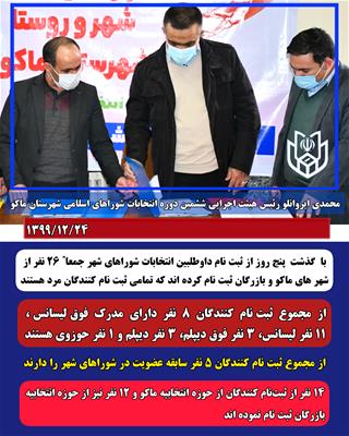 با گذشت پنج روز از ثبت نام داوطلبین ششمین دوره انتخابات شوراهای اسلامی شهر جمعا" ۲۶ نفر از شهرهای ماکو و بازرگان ثبت نام کرده اند که تمامی ثبت نام کنندگان مرد هستند