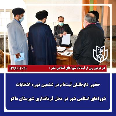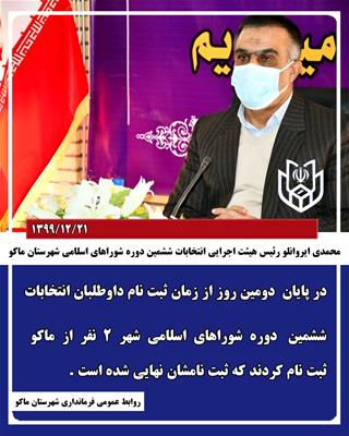 در پایان دومین روز از زمان ثبت نام داوطلبان انتخابات ششمین دوره شوراهای اسلامی شهر ۲ نفر از ماکو ثبت نام کردند که ثبت نامشان نهایی شده است