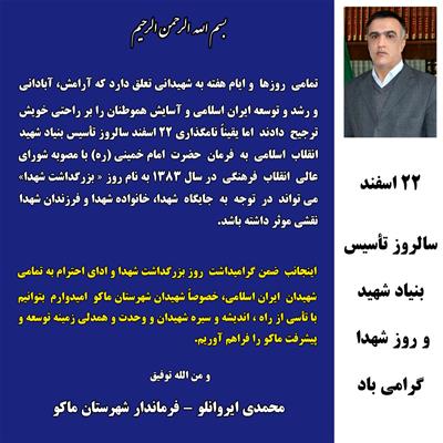 پیام فرماندار شهرستان ماکو بمناسبت ۲۲ اسفند سالروز تاسیس بنیاد شهید و روز شهدا