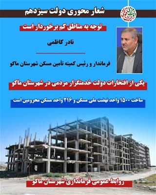 فرماندار و رئیس کمیته تأمین مسکن شهرستان ماکو گفت: یک هزار و 500 واحد نهضت ملی مسکن در شهرستان ماکو در حال ساخت می باشد که یکی از افتخارات دولت خدمتگزار مردمی است.