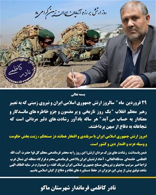 پیام تبریک نادر کاظمی فرماندار شهرستان ماکو به مناسبت 29 فروردین روز ارتش جمهوری اسلامی ایران