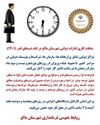 ساعات کاری ادارات دولتی شهرستان ماکو در ایام شبهای قدر 1401