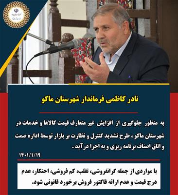 به منظور جلوگیری از افزایش غیر متعارف قیمت کالاها و خدمات در شهرستان ماکو ، طرح تشدید کنترل و نظارت بر بازار توسط اداره صمت و اتاق اصناف برنامه ریزی و به اجرا درآید