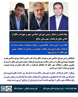 پیام تقدیر و تشکر رئیس شورای اسلامی شهر و شهردار ماکو از فرماندار شهرستان ماکو