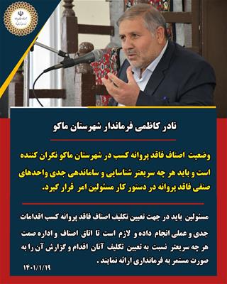 وضعیت اصناف فاقد پروانه کسب در شهرستان ماکو نگران کننده است و باید هر چه سریعتر شناسایی و ساماندهی جدی واحدهای صنفی فاقد پروانه باید در دستور کار مسئولین قرار گیرد .