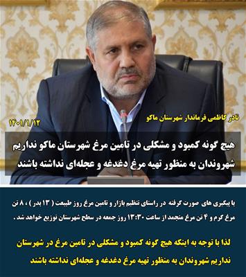هیچ گونه کمبود و مشکلی در تامین مرغ شهرستان ماکو نداریم