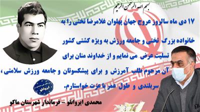 پیام محمدی ایروانلو فرماندار شهرستان ماکو بمناسبت سالروز عروج جهان پهلوان غلامرضا تختی