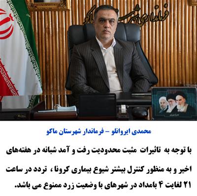 توجه به تاثیرات مثبت محدودیت رفتوآمد شبانه در هفتههای اخیر و به منظور کنترل بیشتر شیوع بیماری کرونا ، تردد در ساعت ۲۱ لغایت ۴ بامداد در شهرهای با وضعیت زرد ممنوع می باشد