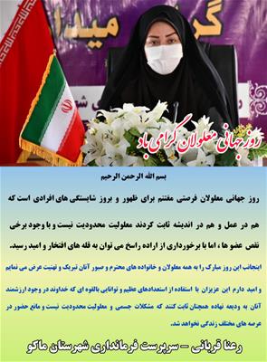 پیام تبریک رعنا قربانی سرپرست فرمانداری شهرستان ماکو به مناسبت روز جهانی معلولان