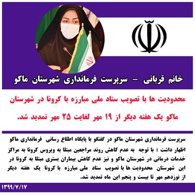 محدودیت ها با تصویب ستاد ملی مبارزه با کرونا در شهرستان ماکو یک هفته دیگر از ۱۹ مهر لغایت ۲۵ مهر تمدید شد.