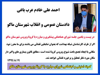 احمد علی خادم عرب باغی دادستان عمومی و انقلاب شهرستان ماکو در بیست و یکمین جلسه شورای هماهنگی پیشگیری و مبارزه با کرونا ویروس شهرستان :