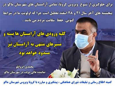 برای جلوگیری از شیوع ویروس کرونا تمامی آرامستان های شهرستان ماکو در پنجشنبه های آخر سال ۲۱ و ۲۸ اسفند تعطیل می باشد