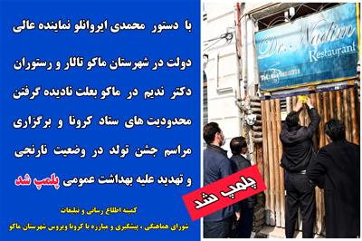 تالار و رستوران دکتر ندیم در ماکو بعلت نادیده گرفتن محدودیت های ستاد کرونا در وضعیت نارنجی پلمپ شد