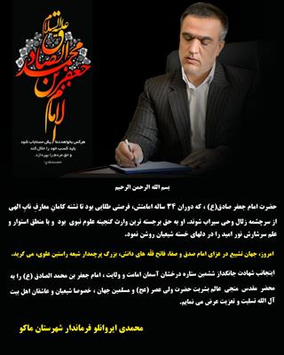 پیام تسلیت محمدی ایروانلو فرماندار شهرستان ماکو بمناسبت شهادت امام جعفر صادق ( ع )