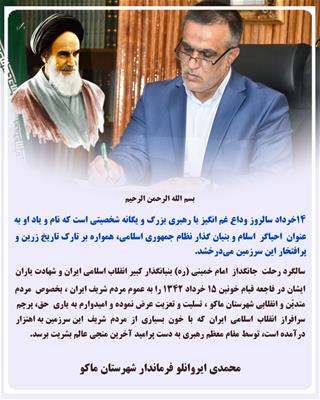 پیام تسلیت فرماندار شهرستان ماکو بمناسبت سالگرد ارتحال امام خمینی ( ره ) و شهادت یاران ایشان در فاجعه قیام خونین ۱۵ خرداد