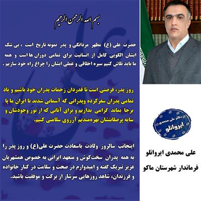 پیام تبریک محمدی ایروانلو فرماندار شهرستان ماکو به مناسبت ولادت باسعادت حضرت علی علیه السلام و روز پدر